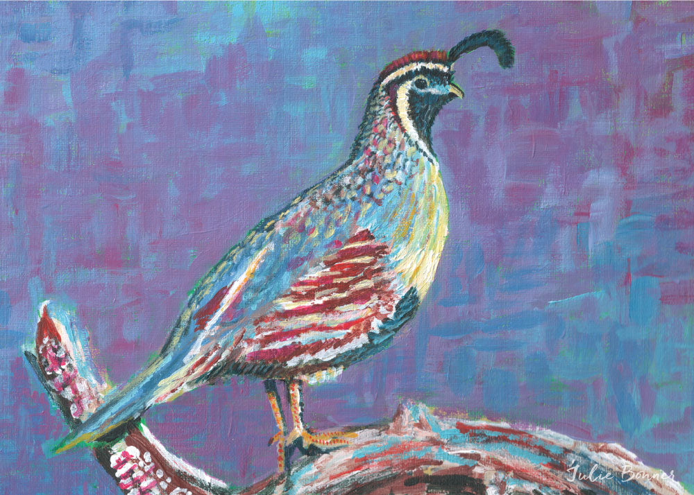 This Quail is one of many southwest animal paintings by Julie. The original was created to teach Julie's son about desert wildlife. The original art was painted using acrylic on canvas. All prints are matted to 11×14 ivory mat, signed and in a cello sleeve.