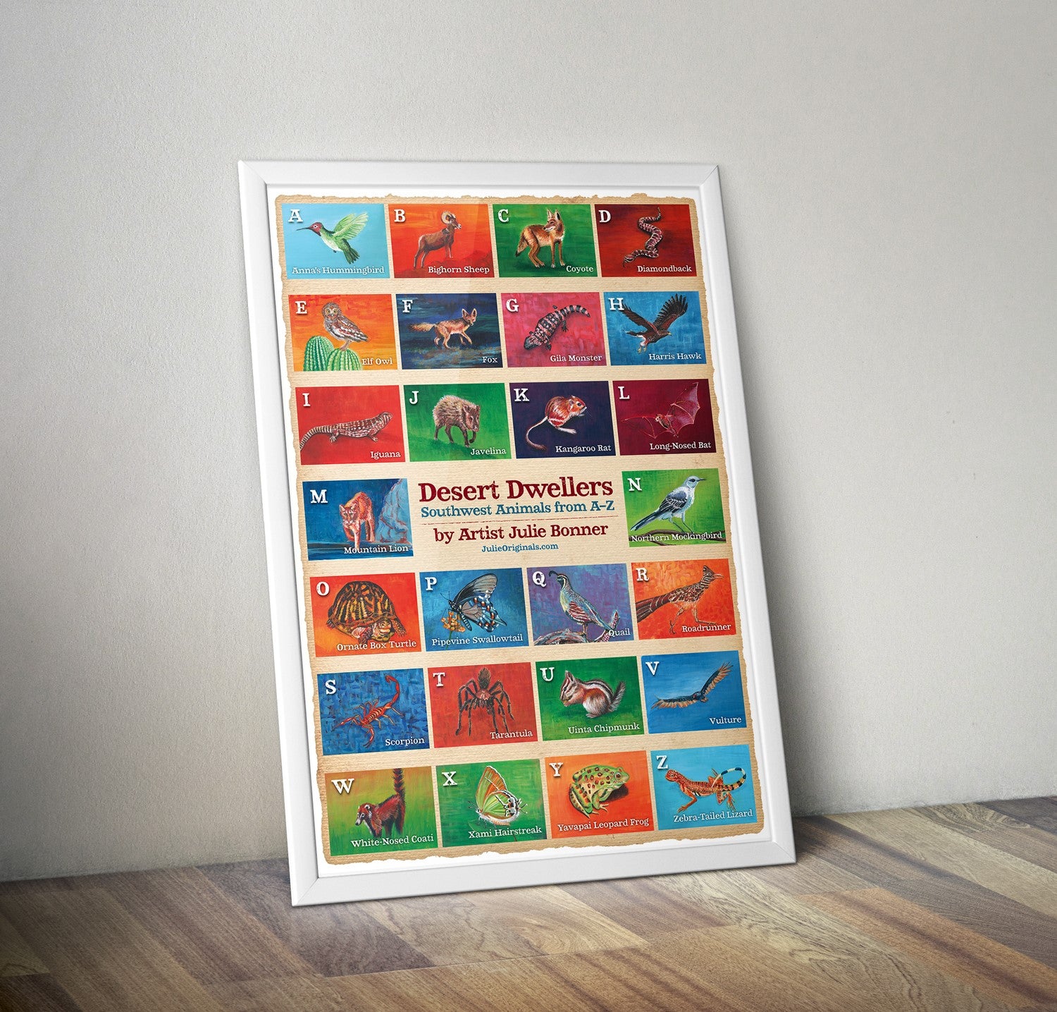 Bring the Desert Dwellers into your classroom and/or kiddo’s room! Colorful desert animals from A-Z on this glossy 18″x24″ poster. All 26 images are also in the Desert Dwellers Flash Cards set. The poster comes neatly rolled in a tube. Available here and at the Tucson Gallery at Proper Shops.