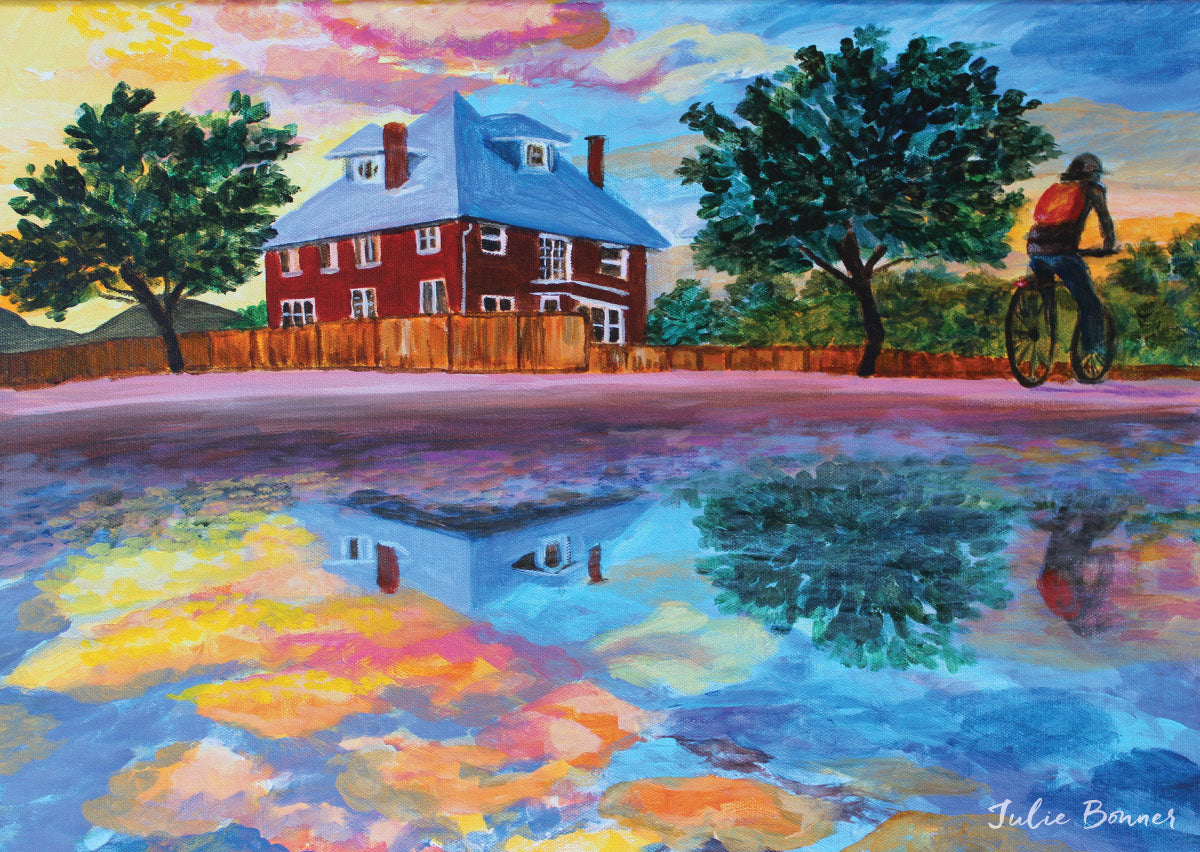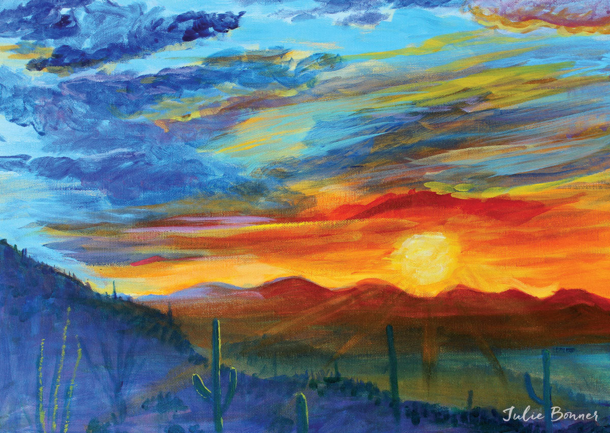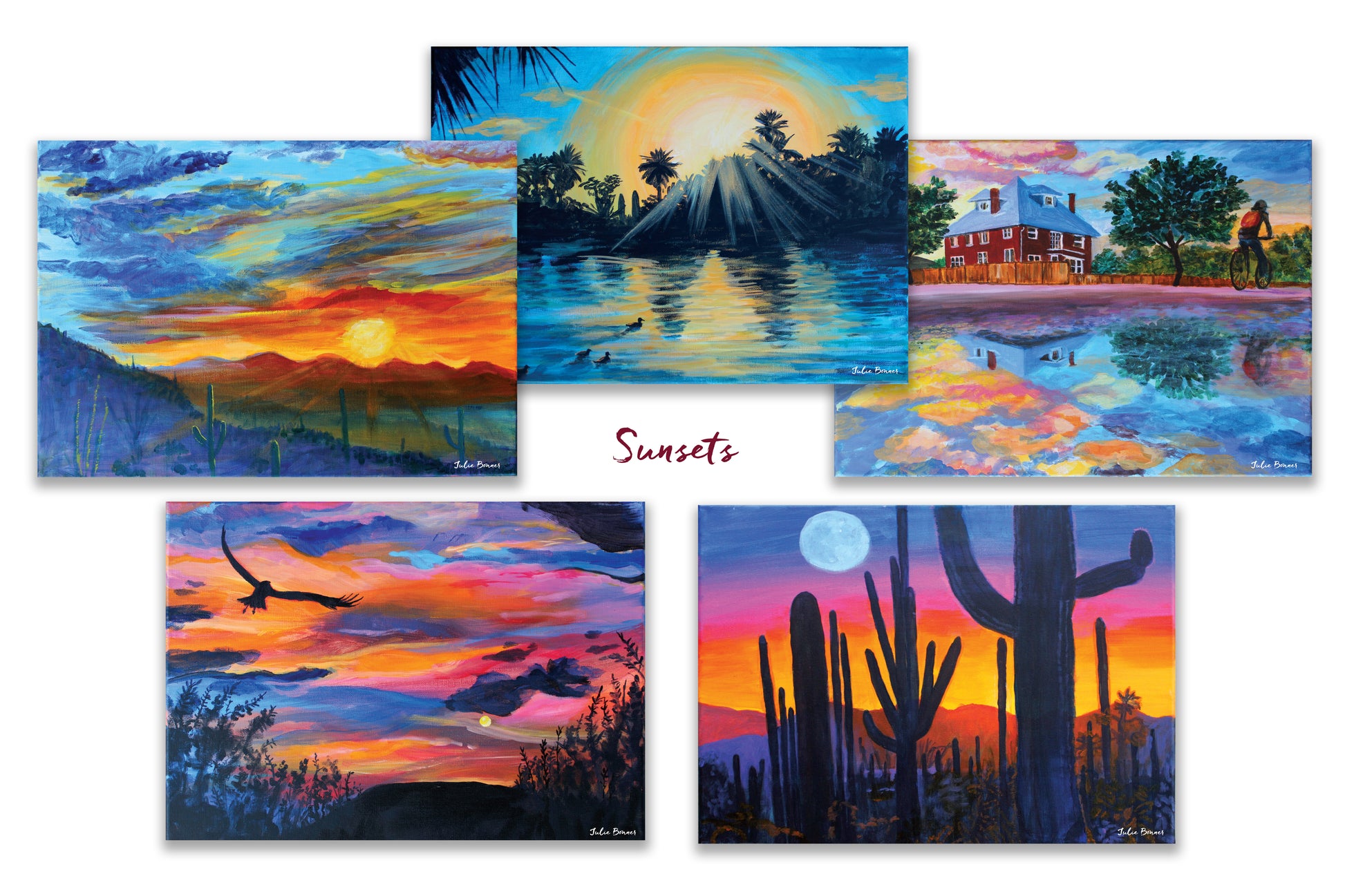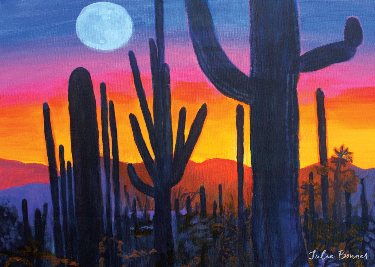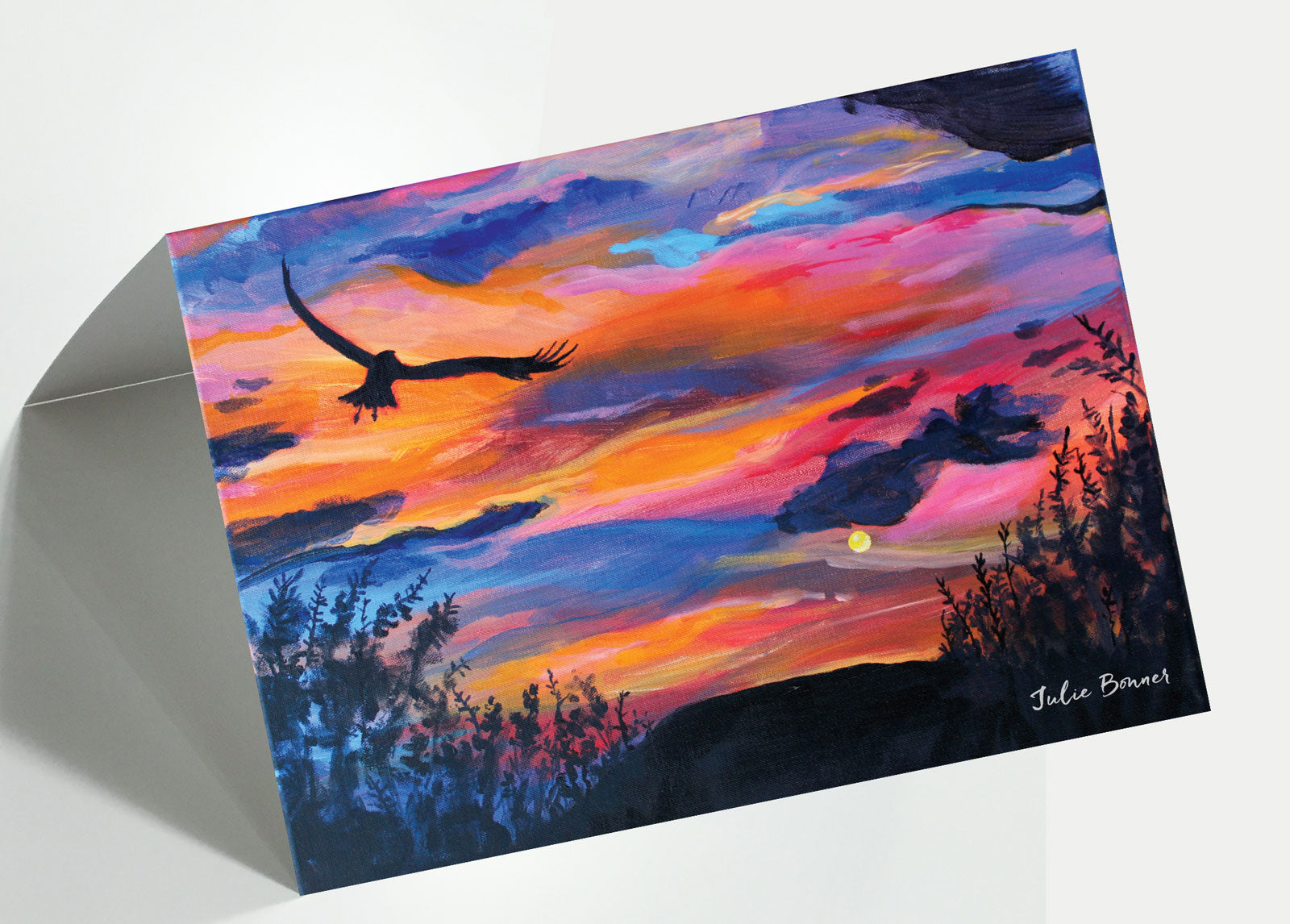 Desert Sunsets Assorted pack includes 5 unique greeting cards featuring prints of “Full Moon”, “Majestic Flight”, “Tucson Evening”, “Monsoon Ride”, “Agua Caliente” all painted by Julie!