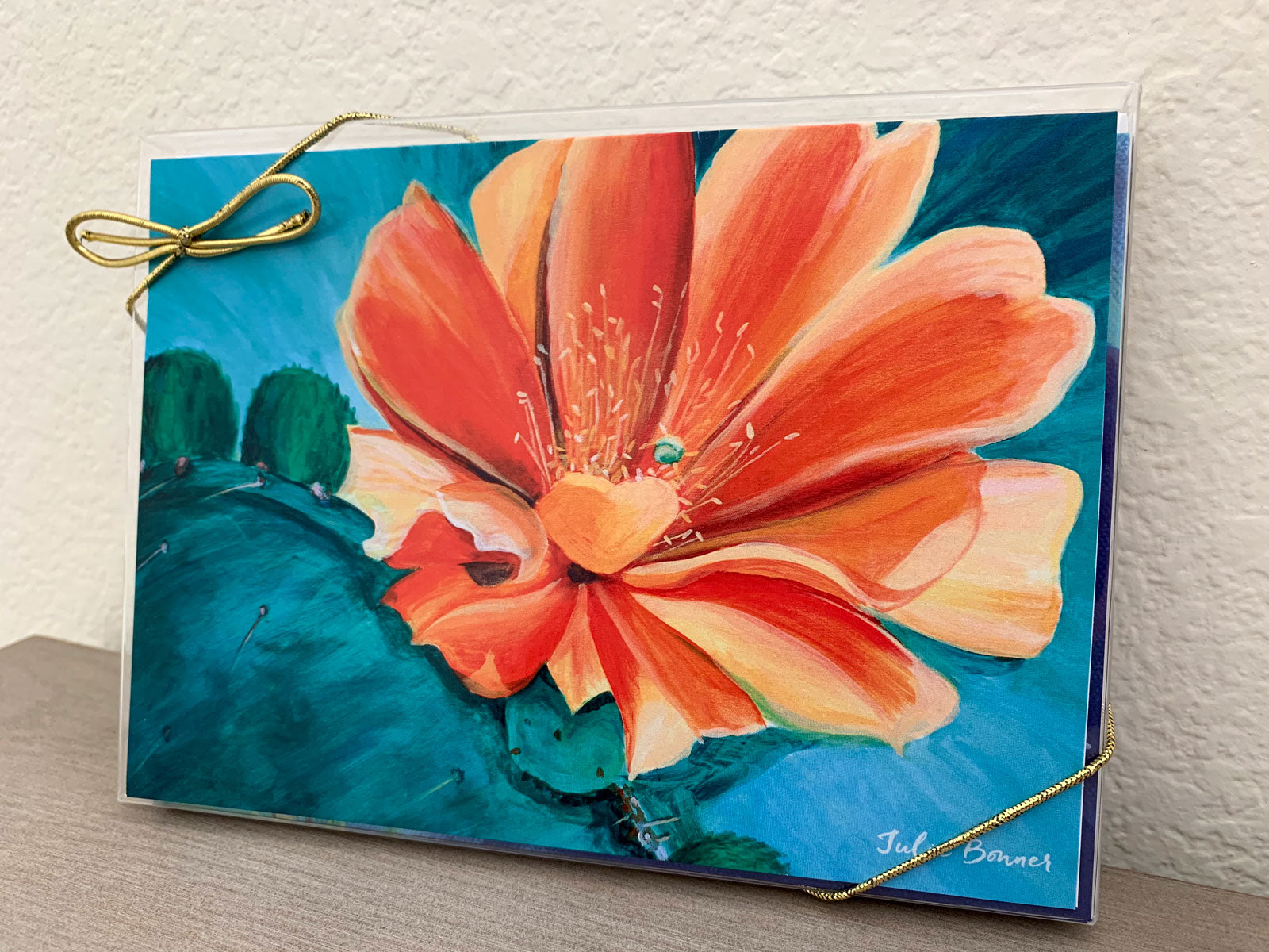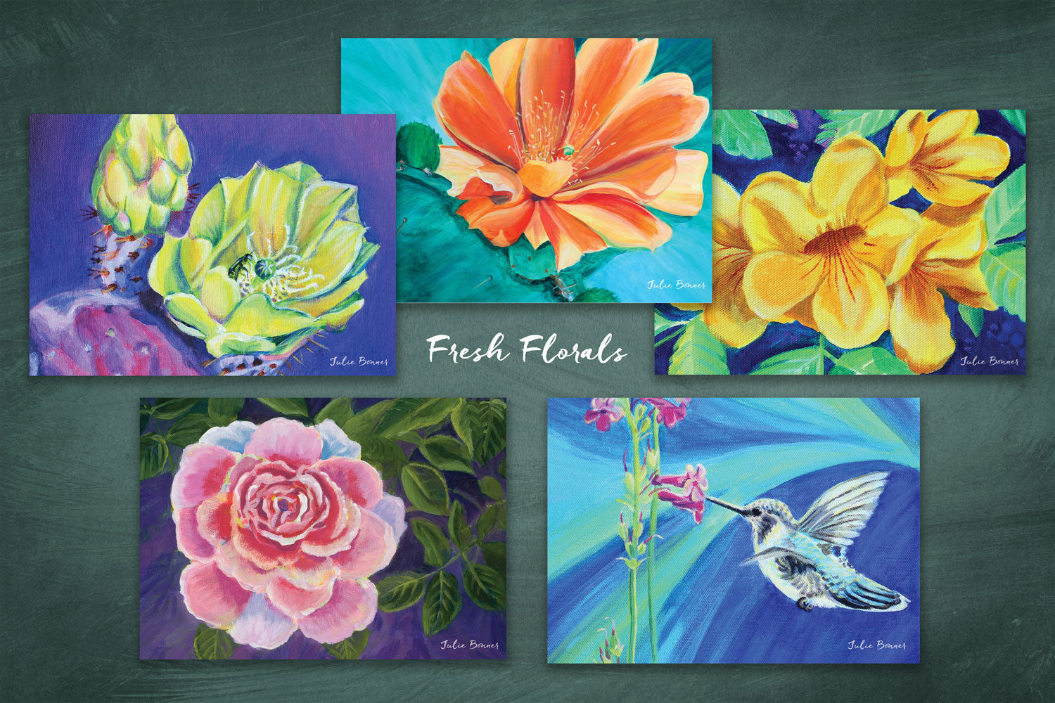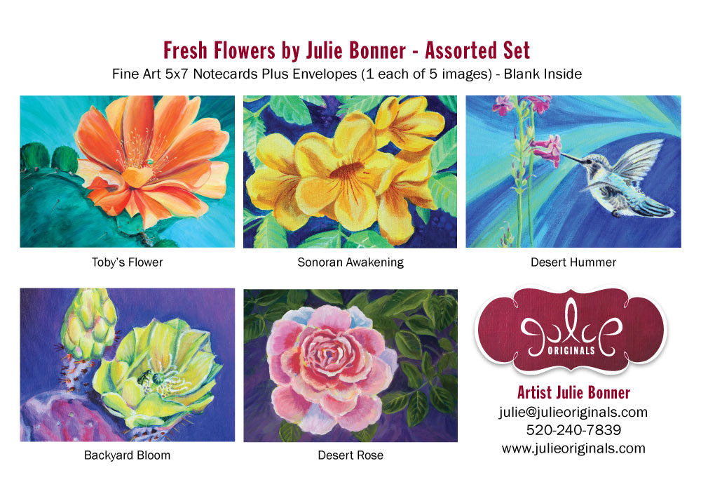 Fresh Flowers Assorted pack includes 5 unique greeting cards featuring prints of “Sonoran Awakening”, “Spring Garden”, “Backyard Bloom”, “Desert Rose”, “Bursting Bloom” all painted by Julie!